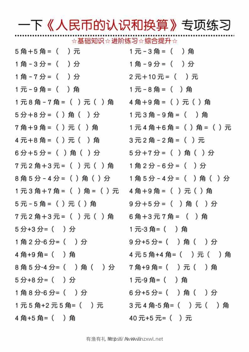 一年级下数学《人民币的认识和换算》专项训练有渔有礼关注私信0498 ——预览已结束,还剩13页未读——开通会员后可免费下载高清完整文档 一年级下数学《人民币的认识和换算》专项训练此内容为付费资源,请付费后查看¥9.8¥29.8会员免费合伙人免费立即购买您当前未登录!建议登陆后购买,可保存购买订单格式pdf页数15 页大小3.66 MB付费资源© 版权声明文章版权归作者所有,未经允许请勿转载。THE END小学数学 喜欢就支持一下吧点赞8 分享QQ空间微博QQ好友海报分享复制链接收藏