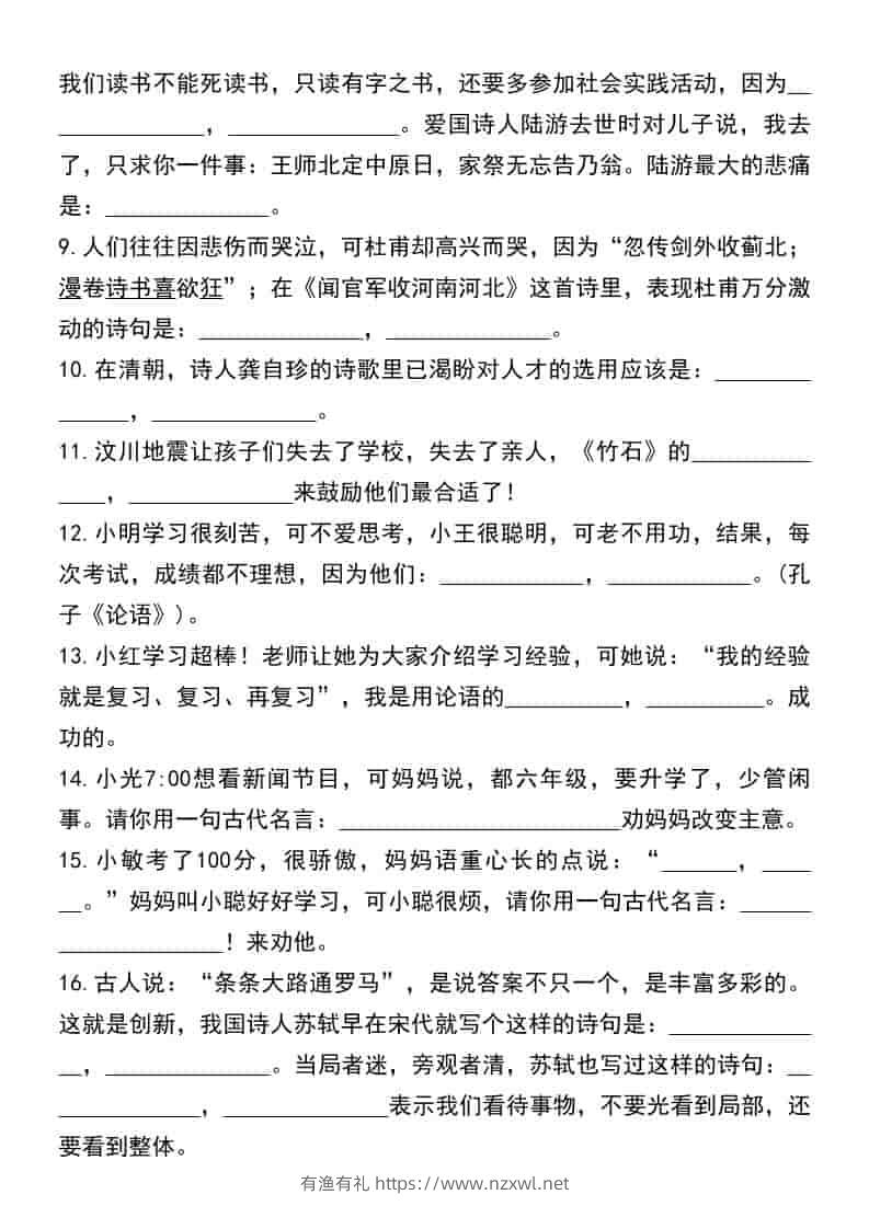 六年级下语文小升初古诗文名句语境默写有渔有礼关注私信04410 ——预览已结束,还剩16页未读——开通会员后可免费下载高清完整文档 六年级下语文小升初古诗文名句语境默写此内容为付费资源,请付费后查看¥9.8¥29.8会员免费合伙人免费立即购买您当前未登录!建议登陆后购买,可保存购买订单格式pdf页数18 页大小286.48 KB付费资源© 版权声明文章版权归作者所有,未经允许请勿转载。THE END小升初 喜欢就支持一下吧点赞10 分享QQ空间微博QQ好友海报分享复制链接收藏