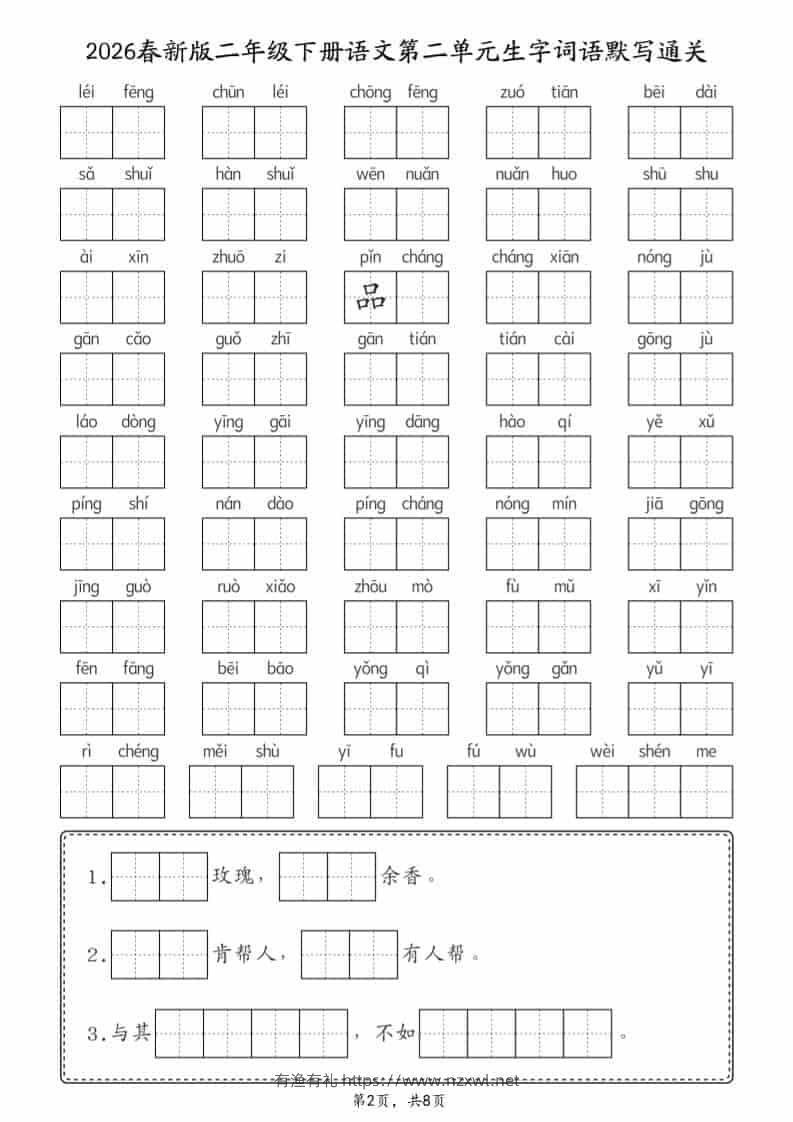 二年级下语文26春1-8单元生字词语默写通关(8页)有渔有礼关注私信04910 ——预览已结束,还剩6页未读——开通会员后可免费下载高清完整文档 二年级下语文26春1-8单元生字词语默写通关(8页)此内容为付费资源,请付费后查看¥8.8¥29.8会员免费合伙人免费立即购买您当前未登录!建议登陆后购买,可保存购买订单格式pdf页数8 页大小3.58 MB付费资源© 版权声明文章版权归作者所有,未经允许请勿转载。THE END小学语文 喜欢就支持一下吧点赞10 分享QQ空间微博QQ好友海报分享复制链接收藏