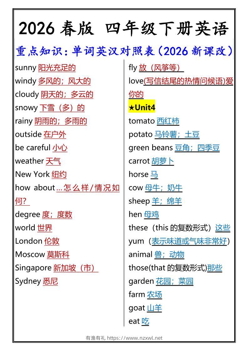 2026春新版四年级下英语重点知识:单词英汉对照表《人教版PEP》有渔有礼关注私信02812 ——预览已结束,还剩1页未读——开通会员后可免费下载高清完整文档 2026春新版四年级下英语重点知识:单词英汉对照表《人教版PEP》此内容为付费资源,请付费后查看¥9.8¥29.8会员免费合伙人免费立即购买您当前未登录!建议登陆后购买,可保存购买订单格式pdf页数3 页大小149.89 KB付费资源© 版权声明文章版权归作者所有,未经允许请勿转载。THE END小学英语 喜欢就支持一下吧点赞12 分享QQ空间微博QQ好友海报分享复制链接收藏